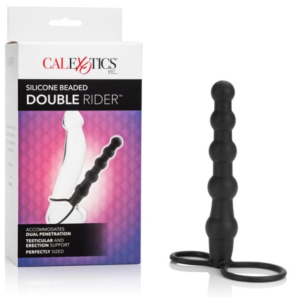 Enjoy erotic double penetration pleasure with the Silicone Beaded Double Rider. The sensually contoured probe is designed for anal ecstasy and delivers tantalizing sensations for an unforgettable mind-blowing climax. The comfortable to wear, pull-on design also provides additional testicular and erection support for prolonged DP fun. To use, slip the smaller loop around the base of the erect penis, and secure the larger loop around the scrotum. For heightened sensitivity, and ultimate orgasmic pleasure, always use a quality lubricant with this toy. Play out your secret threesome fantasies without the need to invite someone else to join in the intimate fun. The erotically beaded probe maximizes penetration pleasure, and also maintains a rock hard erection for extended performance satisfaction. Before and after play, clean the supportive contoured anal probe with mild soapy water, or a toy cleaner spray.