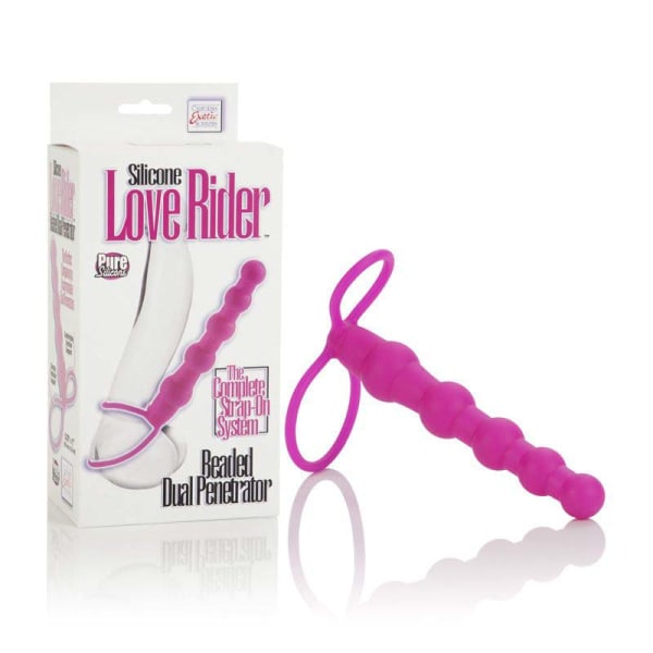 The Silicone Love Rider Beaded Dual Penetrator turns your pleasurable encounters into a memorable orgasmic experience. The sturdy beaded probe lets you spice up your erotic activities without the need to invite a third person along. With this versatile penetrator, you can share the experience of the filled up' double penetration feeling with your lover. The Silicone Love Rider Beaded Dual Penetrator measures 5.75 x 1/14.5 cm x 2.5 cm and is made from unscented premium silicone. The flexible shaft features a selection of smooth, graduated beads that provide intense pleasure. For comfortable and pleasurable insertion, the penetrator shaft also has stretchy loops that slip over the erect penis and provide testicular support. For increased satisfaction, always use a quality lube with this exotic toy. The penetrator offers flexible stimulation and climax options, and can also be used with a strap on. The Silicone Love Rider Beaded Dual Penetrator is perfect for adventurousfirst-time and experienced users who want to enjoy a double P experience. Alternate the insertion location for maximum thrills and unlimited ecstasy. Before and after every use, remember to clean the penetrator with a toy cleaner spray or wash it in warm, soapy water.
