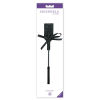 Covered in a luxurious lacy fabric, the head of this stylish, sleek crop is set off with a lavish black corseted ribbon and satin bow. The stem is made of a thin yet sturdy rod. The handle is covered at the base with the same lacy fabric.