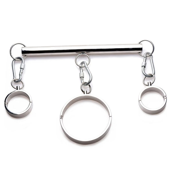 Take your bondage scenes to a fantasy realm where slaves are locked up in shackles for the amusement of their owners. This beautiful stainless steel yolk set includes sophisticated collar and cuffs with O-rings for attaching them to each other or other BDSM accessories. Each has a discreet and elegant pin-lock that opens and closes with a hex key. A connector bar and 3 carabiners create a yoke that will keep your partners hands up by their neck and out of your way as you play with their vulnerable body. The gleaming chrome is strikely attractive, with the classic aesthetic that will enhance the atmosphere of your scenes.