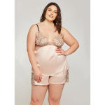 Satin and lace cami set with eyelash lace and adjustable shoulder straps.