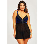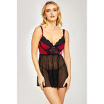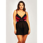 Padded cup babydoll with tassel at center front, velvet binding, mesh skirt and hook and eye closure.