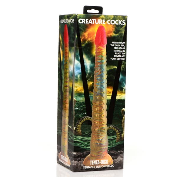 This long tentacle will reach deep inside you! Designed for backdoor enjoyment, this colorful tentacle dong has a row of suckers on one side and a ropey, ribbed shaft along its long, 11 inch tentacle arm. The colorful design mixes reds, yellows and blues to create a unique look that is scaly, mystical and stands out amongst your toys! Made out of premium, phthalate-free silicone, it has a firm core and is flexible and smooth. Use the wide, suction-cup base to keep it in place and use it hands-free, or combine it with a compatible strapon harness for kinky cosplay, fantasy roleplay, or hot pegging play! This thin dong has a tapered tip for easy insertion and gradually gets larger as you go deeper, but stays relatively thin so you can go further and play longer! After play is over, wash the dildo with warm water and soap and use a toy cleaner to spray clean. Wipe dry and store in a cool, dark place out of direct sunlight.