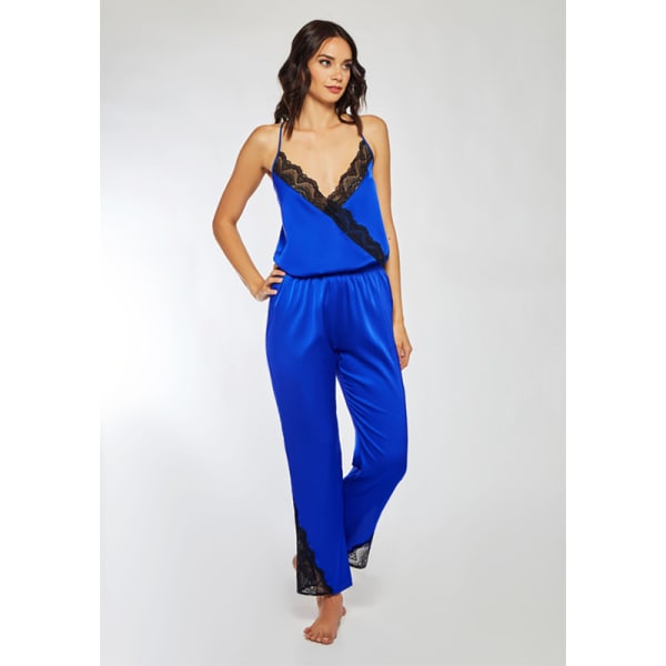Satin jumpsuit with lace embellishment, cross back and satin bow trim.