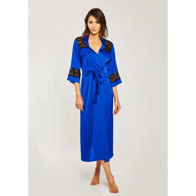 Satin long robe with lace embellishment and waist tie.