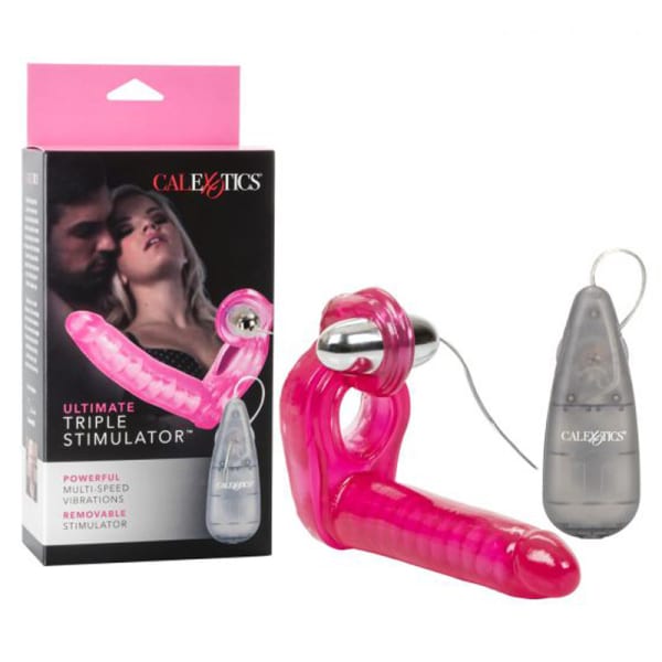 Increase and maximize your intimate pleasure with the Ultimate Triple Stimulator. The erotic and exotic couples enhancer delivers intensely satisfying ecstasy for him and her. The supportive penis ring boasts triple contact action that stimulates your every desire. Enjoy the ultimate DP experience without inviting a new friend to join in! The easy to use set comprises of a sturdy and soft, unscented phthalate free PVC support ring with a contoured clitoral teaser, and an attached flexible vertebrae dong. The arouser simultaneously delivers intensely pleasurable clitoral stimulation thrills and an orgasmic double penetration experience. The enhancer also includes a vibrating multi-speed bullet, with cord attached power pack. The stimulator provides optimal stamina support for enhanced erection maintenance and a rock hard performance every time. The flexible sensually textured penis shaped dong maximizes and doubles the pleasure for a heightened amorous encounter. The removable bullet can also be used to arouse and stimulate red-hot erogenous zones and super sensitive sweet spots all over the body. To increase the satisfaction even further, always use a quality lube with this toy.