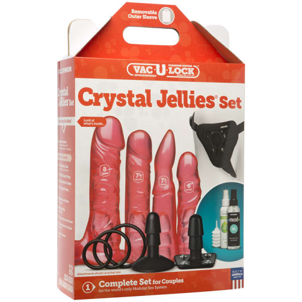 A burst of color makes your play time pop with the Vac- U- Lock Crystal Jellies Set. This deluxe strap- on kit gets your play going in a snap with a complete harness including removable o- rings and the patented Vac- U Plug, four distinct and exciting Crystal Jellies Vac- U- Lock attachments in translucent pink, and a bottle of Mood water- based lube.