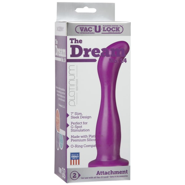 Based on the best-selling Lucid Dream No. 14, this lovely purple Dream No. 14 curves perfectly to nestle against the G-spot and provides a pleasurable fullness. Firm yet flexible, this luxurious dildo is made of 100% phthalate-free Platinum Premium Silicone and has an insertable length of 7. Interchangeable with all Vac-U-Lock products and fully harness compatible. Proudly Made in America.