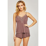 2 PC viscose cami and shorts set with lace trim at neckline and waistband Material: 95% Viscose 5%Spandex