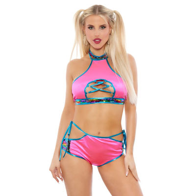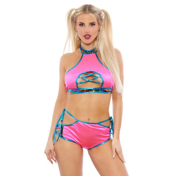 Dance the night away in our Rainbow Sequin Bra Set, perfect for the dancefloor. This set features a hot pink halter top with a vibrant blue metallic and rainbow sequin trim throughout. The hook and clasp closure ensures a secure fit while you move. Complete your look with the high-waist panty featuring tie sides for added flair.