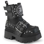 3 1/4" (83mm) Chunky Heel 2" (51mm) Square-Toe Platform Ankle Boot Featuring Ornamental Double Grommet Buckle Strap, 'Demonia’ Patch Branded Shield w/ Dual Hook-N-Loop Straps and Cone Studded Upper Details, Inside Metal Zip Closure