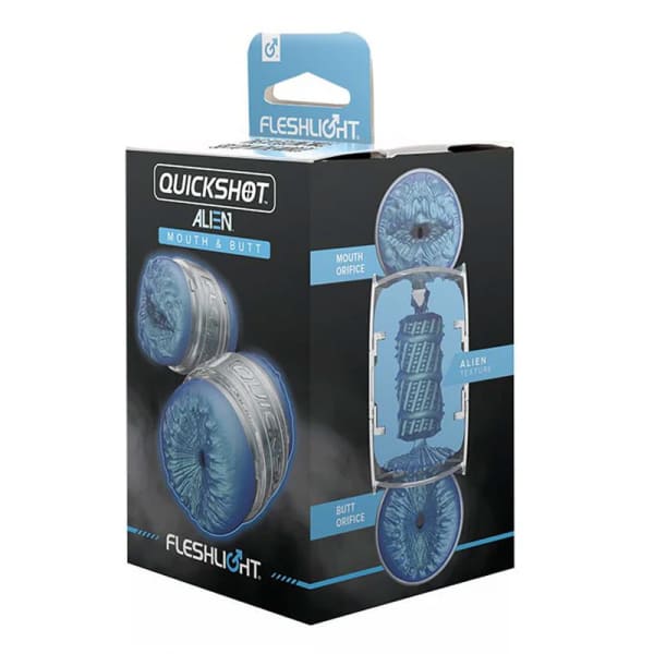 The Alien Quickshot has landed, bringing along with it an otherworldly sexual experience. A more compact, easy-to-store version of our standard Alien Fleshlight, this little blue babe can be penetrated from the mouth or butt orifice – you decide! DISCLAIMER: While most of our male customers can enjoy the Quickshot line of products, there are some individuals whose endowment may prevent them from doing so comfortably. A customer whose penis at any area is girthier than approximately 5.5” or 14 cm may find the Quickshot too tight or restrictive. Customers should use their best judgement to determine if this Fleshlight toy would be the right size for them – if not, there is a wide variety of full-size Fleshlight toys to choose from! Please note that opened/used toys may NOT be returned for refunds. Men with larger girth penises may still be able to use the Quickshot sleeve without its casing, but that is left to the individual user’s discretion.